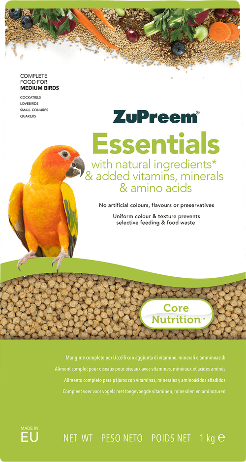 Fuldfoder til fugle. ZuPreem Essentials med tilsat vitaminer, mineraler og aminosyrer er et komplet dagligt foder til kæledyrsfugle og giver en sund og lækker kost til daglig fodring. Fodringsvejledning: Komplet fuglefoder til mellemstore og mindre fugle: Mindre papegøjer og større parakitter, nymfeparakitter, so
