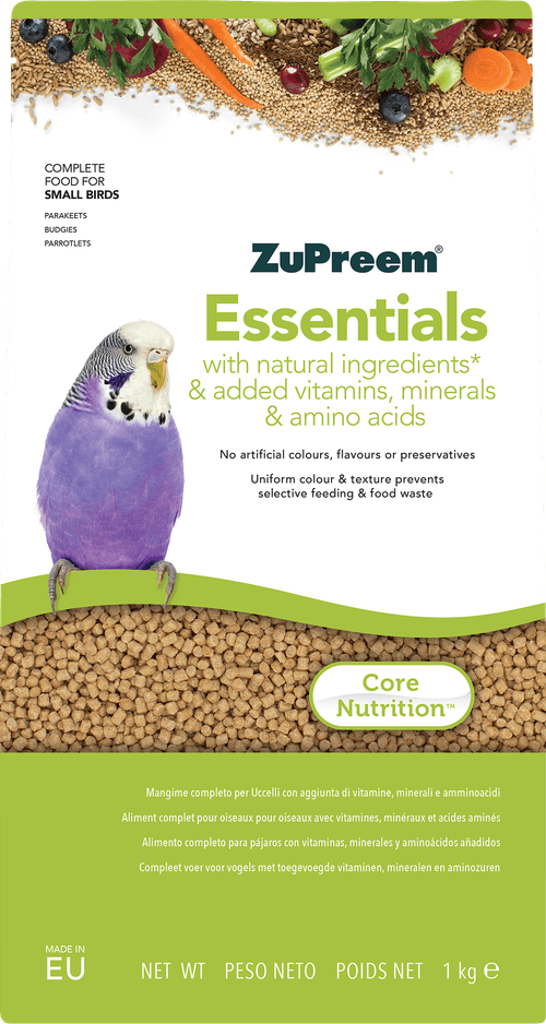 Fuldfoder til fugle. ZuPreem Essentials med tilsat vitaminer, mineraler og aminosyrer er et komplet dagligt foder til kæledyrsfugle og giver en sund og lækker kost til daglig fodring. Fodringsvejledning Komplet fuglefoder til små fugle: små papegøjer og små parakitter, undulater, dværgpapegøjer, flagermuspapegøjer nymfeparakitter m.fl.Juster mængderne for optimal foderstand for din fugl. Hvis du har spørgsmål om din fugls daglige fodringsplan, bedes du kontakte BBBird eller din dyrlæge for mere specifik fodringsinformation. Sørg for, at der altid er frisk mad og vand til rådighed. Smid al uspist mad ud før hver fodring. Som med alle fødevarer skal du vaske hænder og mad- og vandskåle før hver fodring. Når du introducerer en ny mad, skal du starte med en blanding af "gammel" og "ny" mad. Øg gradvist mængden af ny mad over en periode på syv til ti dage.